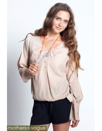 Топ выполнен из легкой экологичной ткани с бамбуком (не трикотаж) светло-песочного цвета. Для кормления отодвигается вниз внешний слой горловины на пуговицах, для доступа к внутреннему топу. Конструкция топа позволяет носить его и во время беременности, и после родов.