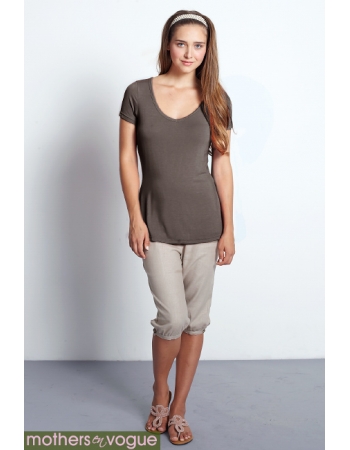 Топ выполнен из экологичного бамбукового трикотажа, он имеет двойной слой, для кормления верхний слой ткани открывается снизу, внутренний слой имеет прорези для груди по бокам. Конструкция топа позволяет носить его и во время беременности, и после родов.
