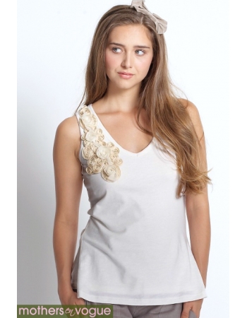 Топ выполнен из мягкого хлопкового трикотажа и украшен вышивкой лентами. Топ имеет двойной слой, для кормления верхний слой ткани открывается снизу, внутренний слой имеет прорези для груди по бокам. Конструкция топа позволяет носить его и во время беременности, и после родов.