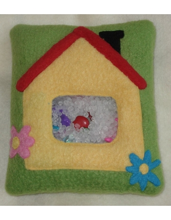 Cделана из мягкого флиса. Наполнитель - полиэтиленовый гранулят высокого давления, разрешенный к применению в пищевой промышленности и детских игрушках, и мелкие игрушки из пластика или металла.