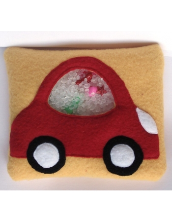 Cделана из мягкого флиса. Наполнитель - полиэтиленовый гранулят высокого давления, разрешенный к применению в пищевой промышленности и детских игрушках, и мелкие игрушки из пластика или металла.