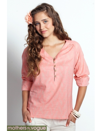 Топ выполнен из легкой хлопковой ткани (не трикотаж). Для кормления отодвигается вниз внешний слой горловины на пуговицах, для доступа к внутреннему топу. Конструкция топа позволяет носить его и во время беременности, и после родов.
