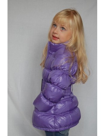 Куртка для девочки с широким поясом. В воротнике - скрытый капюшон, в рукавах - манжеты.