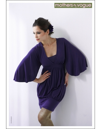 Платье выполнено из мягкой, струящейся ткани фиолетового цвета. Конструкция платья позволяет носить его и во время беременности, и после родов: оно мягко принимет форму меняющейся фигуры.