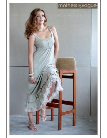 Платье выполнено из мягкой, струящейся ткани. Конструкция платья позволяет носить его и во время беременности, и после родов, мягко принимая форму меняющейся фигуры.