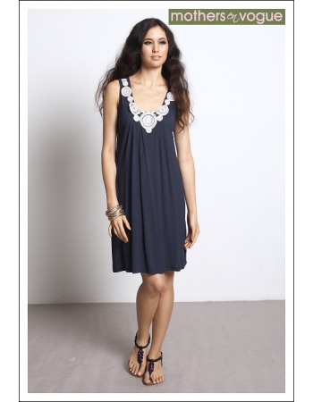 Платье выполнено из мягкой, струящейся ткани темно-синего цвета. Горловина платья украшена вышивкой и прозрачными блестками, доступ к груди закрыт центральными складками ткани. Конструкция платья позволяет носить его и во время беременности, и после родов.
