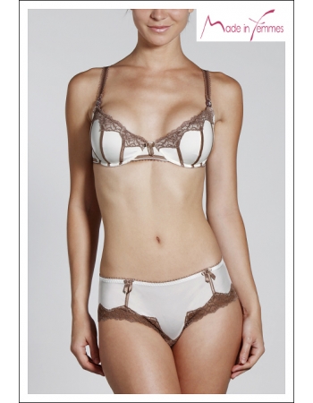 Трусики в виде шортиков в комплект к бюстгалтеру Made in Femmes Gourmandise Ivoire выполнены из мягкой микрофибры, которая сочетает бесконечную нежность и отличную эластичность. Они украшены бежевым кружевом и тесьмой, изнутри отделаны хлопком.