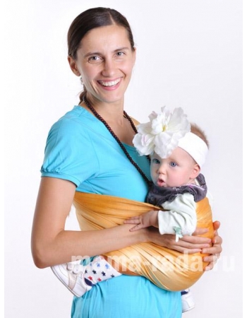 Слинг нежного желто-персикового цвета, однотонный со светло-коричневыми широкими полосами.
