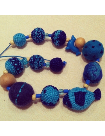 Все бусины разной фактуры, формы и цвета, специально сделаны для того, чтобы малышу было интереснее перебирать их, развивая свою мелкую моторику:  яркая игрушка, шуршащая бусина,  гремящая бусина, ворсистая бусина, бусина-пуговица.