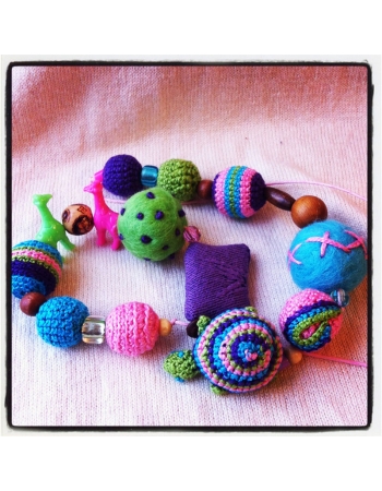 Все бусины разной фактуры, формы и цвета, специально сделаны для того, чтобы малышу было интереснее перебирать их, развивая свою мелкую моторику:  яркая игрушка, шуршащая бусина,  гремящая бусина, ворсистая бусина, бусина-пуговица.