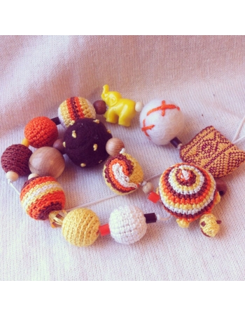Все бусины разной фактуры, формы и цвета, специально сделаны для того, чтобы малышу было интереснее перебирать их, развивая свою мелкую моторику: яркая игрушка, шуршащая бусина, гремящая бусина, ворсистая бусина, бусина-пуговица.