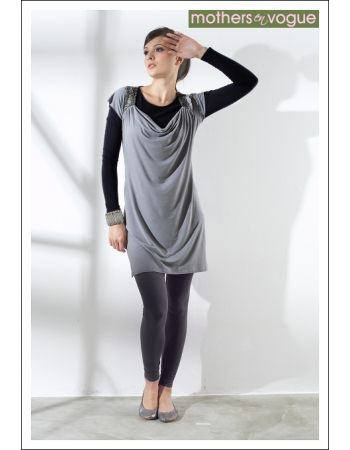 Туника выполнена из 2 частей: внутренний короткий топ с длинными рукавами, заканчивающийся сразу под грудью, с эластичной отделкой внизу, и туника без секрета, украшенная пайетками. Для кормления отодвигается горловина туники и поднимается нижний край внутреннего топа.