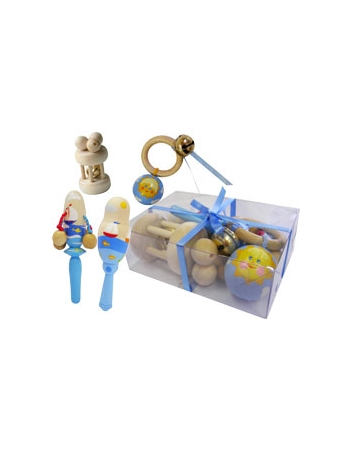 В набор входят: погремушка с бусинами окрашенная, погремушка с горохом окрашенная, погремушка"Шумелка" неокрашенная, погремушка "Шарик на колечке"