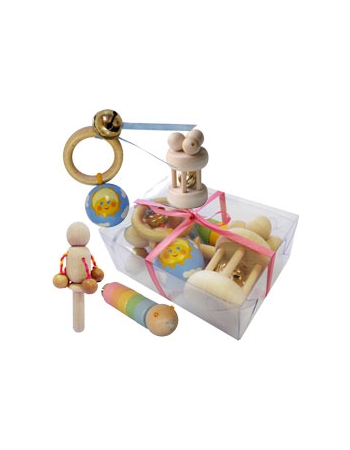 В состав набора входят: погремушка "Шумелка" неокрашенная, погремушка "Шарик на колечке", погремушка с бусинами неокрашенная, гусеничка-малютка.